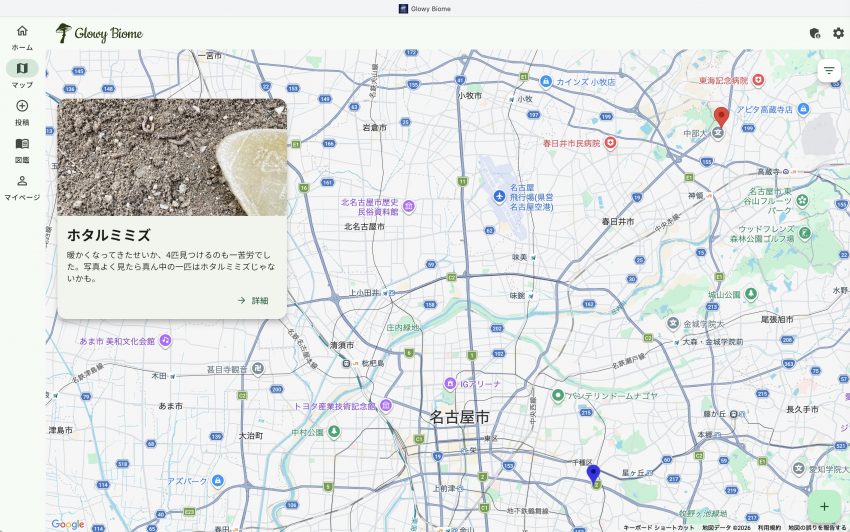 作ってくれたのは、サイエンスマスター代表の山下さん。素晴らしいアプリを立ち上げて私に丸投げしてくださったので、私が管理人さんになりました。発光生物の情報収集にご協力ください。今の時期ならホタルミミズですね。私もさっそく2件投稿しました。