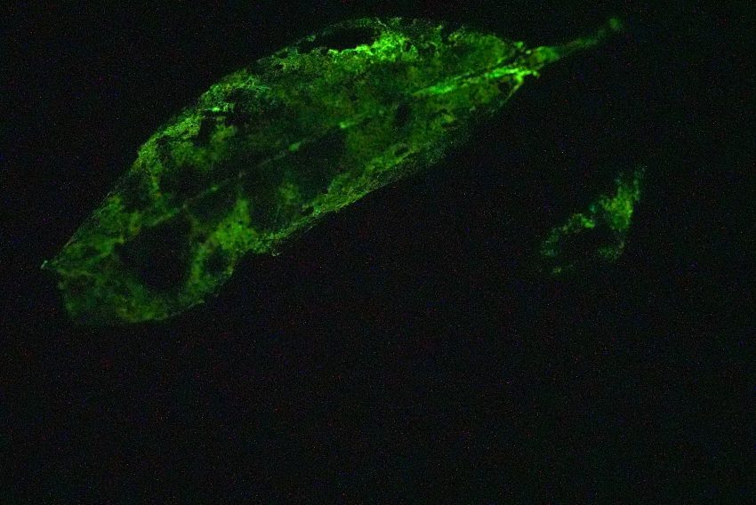 オキアミがものすごく光ってました。午前中に釣具屋で仕入れてきたんですが、あんまりいい色じゃなかったので心配でしたが、ビカビカ光ってました。光る落ち葉も、暗闇によく目を慣らしてから観察してもらったおかげで、皆さんすぐに見つけてくれました。